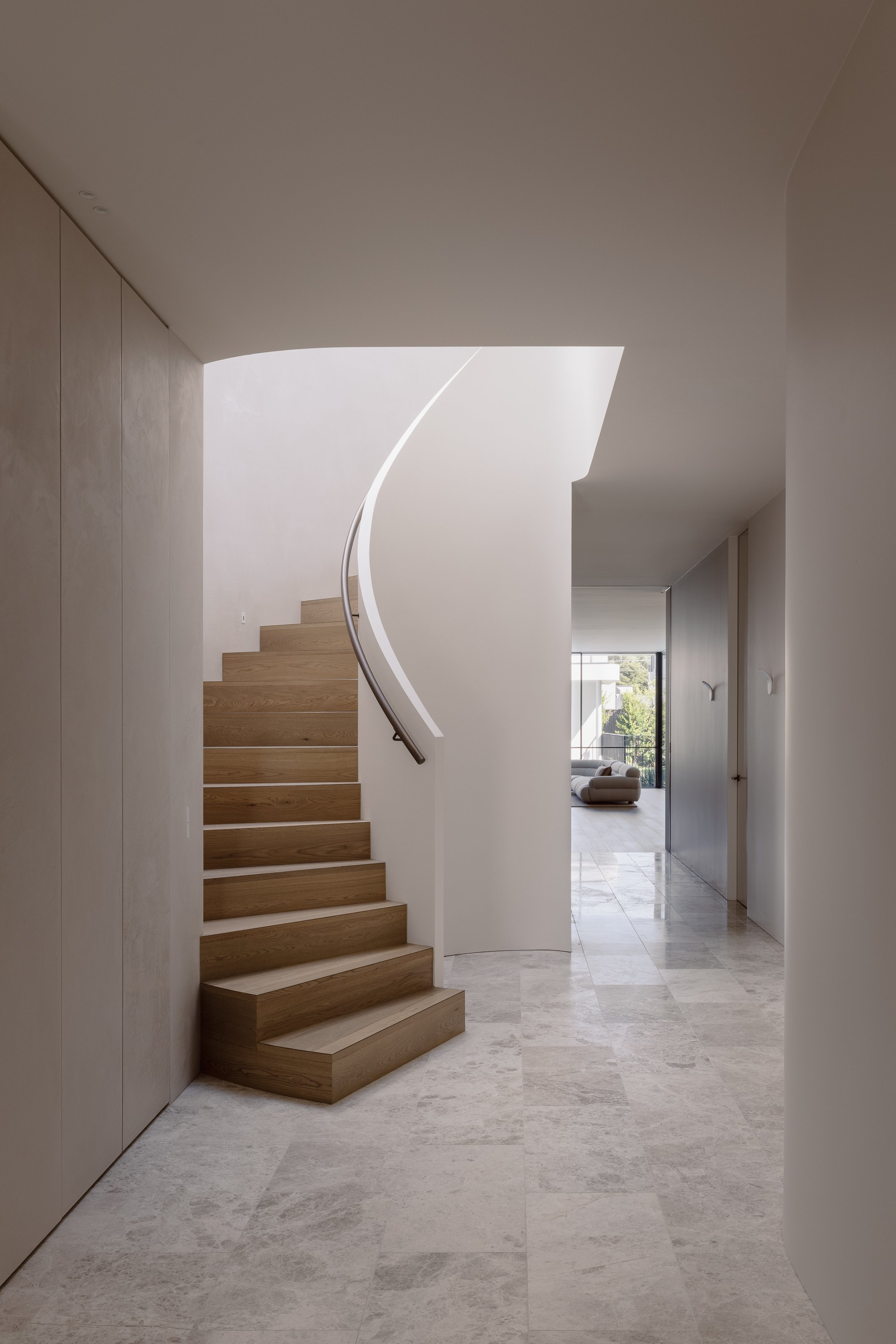 Externally, the facade balances clean modern lines with an interplay of textures including metal, concrete, timber and perforated white bricks, lending depth and visual interest to the composition. Curved glass windows soften the facade and frame picturesque views from the living areas.
