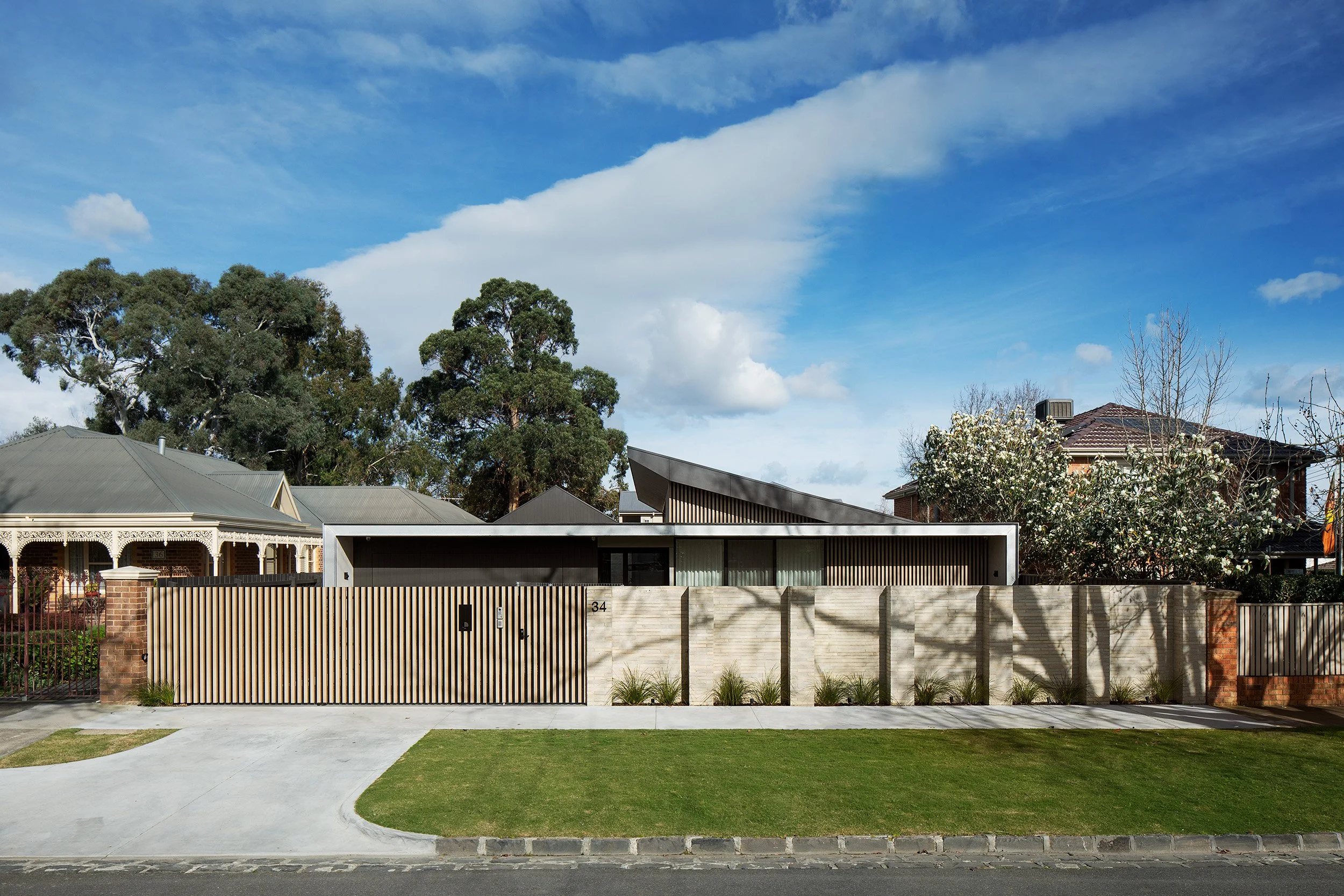 Concealed behind a front wall made of handcrafted bricks, the front façade of the house sits long and low on the block, a clean and modern form with sharp detailing and a palette of exposed steel, concrete-lined walls and timber battens.