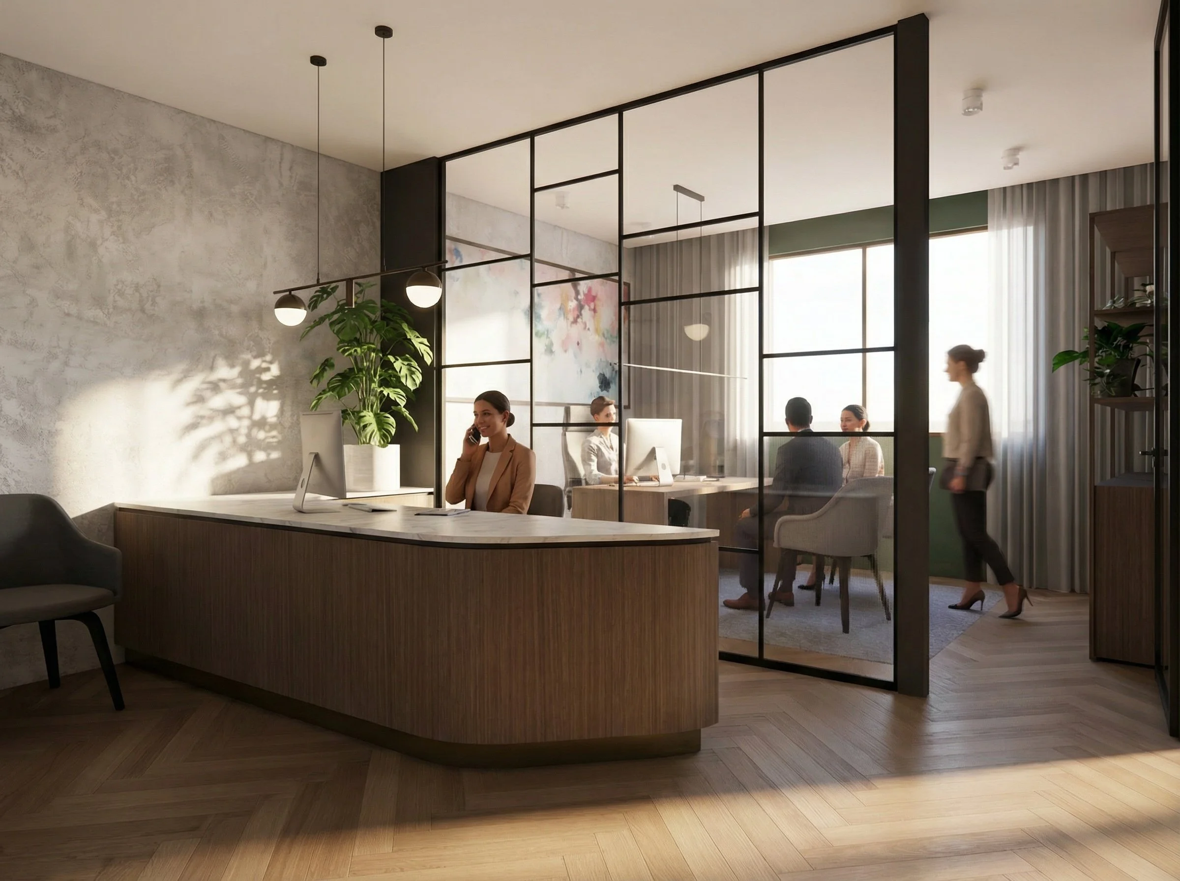 The interior features oak chevron floorboards that add texture and elegance underfoot, complemented by a custom-designed curved reception desk with a marble top as the focal point of the entry. Soft sage green walls provide a calming backdrop, while steel-framed glass partitions define the space without compromising light or openness. The addition of sheer curtains and steel-framed bookshelves introduces a sense of softness and sophistication, achieving a refined balance between structure and comfort.