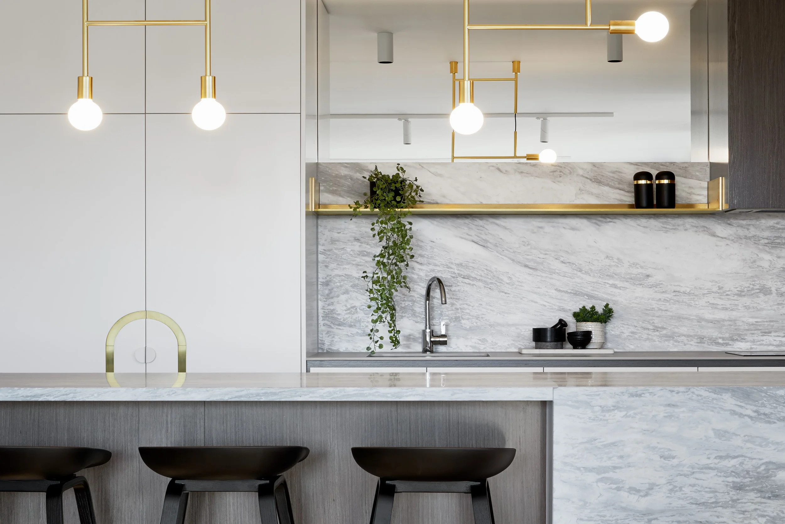 Each apartment has been designed to be spacious and stylish, each with access to natural light and direct views to the street trees from their main living spaces. Each space has been carefully designed with functionality in mind, complemented by a combination of natural timber, marble, natural stone and glass. Brass highlight elements including custom curved finger recesses, solid brass shelves and custom, locally designed light fittings add individuality and personality to each apartment.